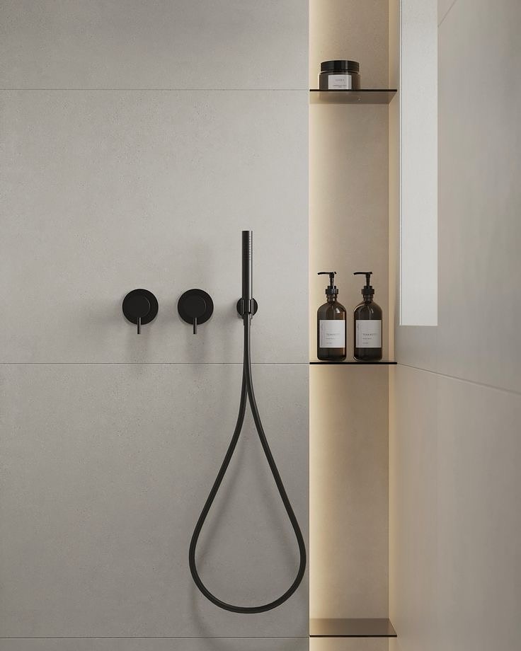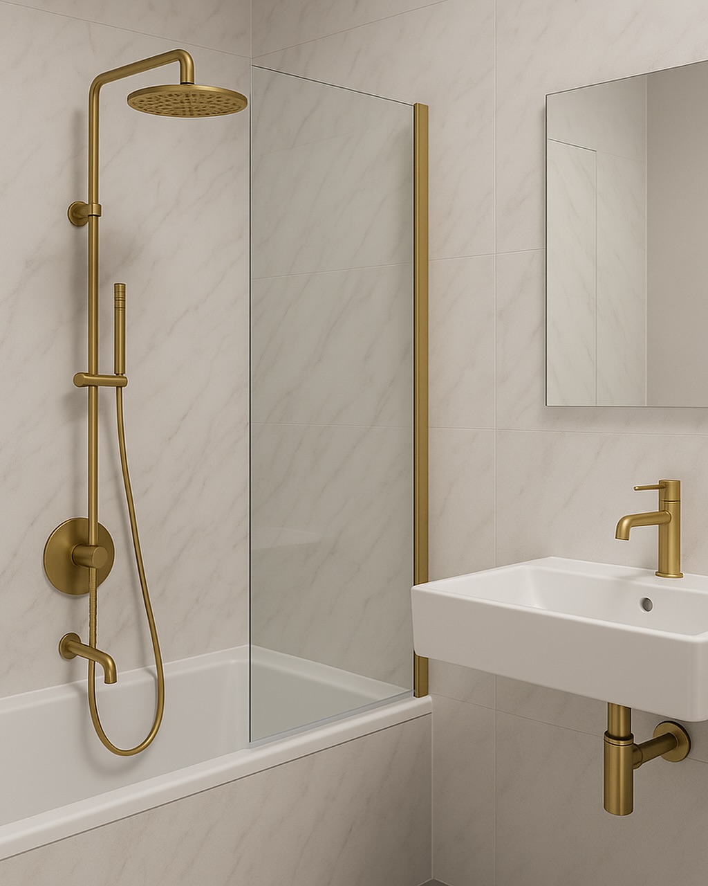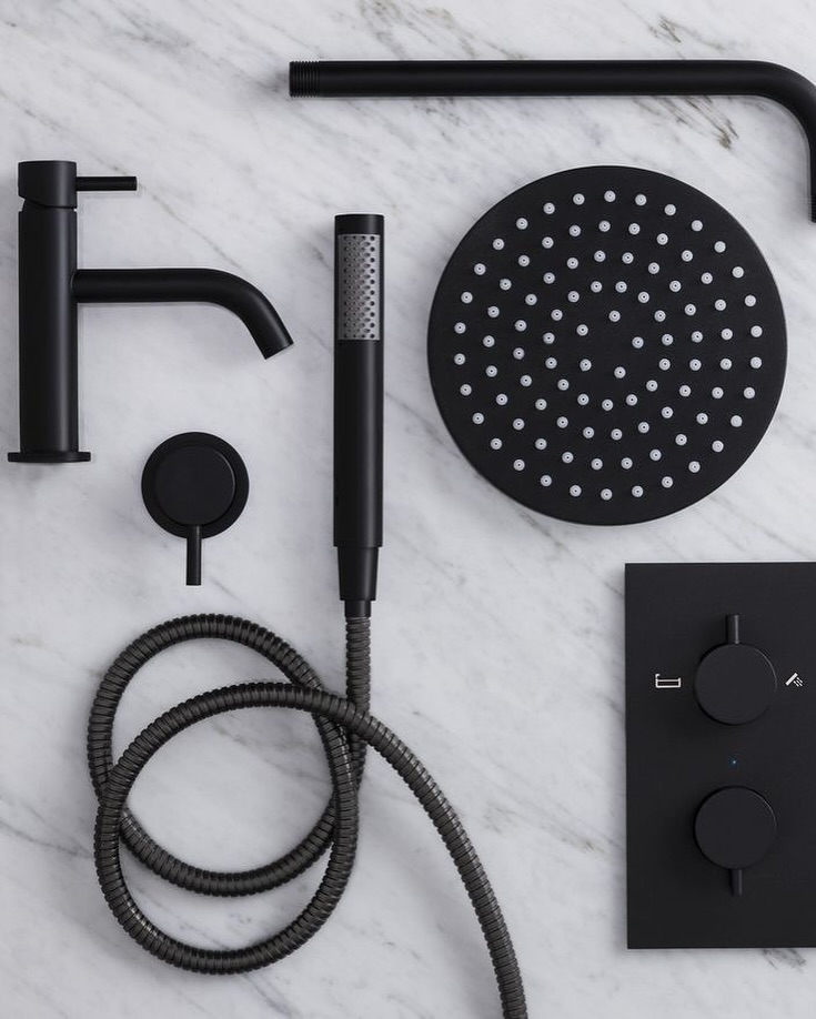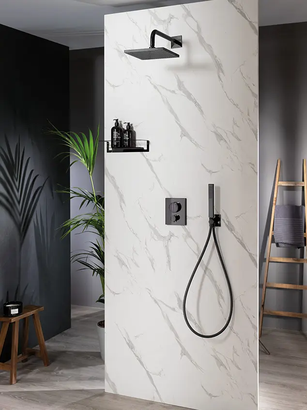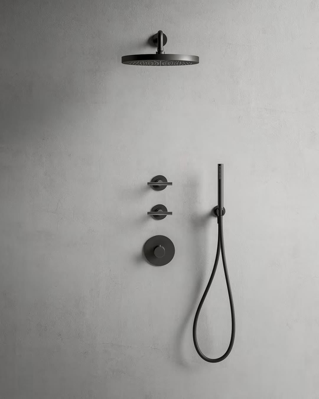 KLUDI BOZZ "7-in-1" - a high-end shower kit featuring sleek minimalism and luxurious finishes like matte black or brushed gold.